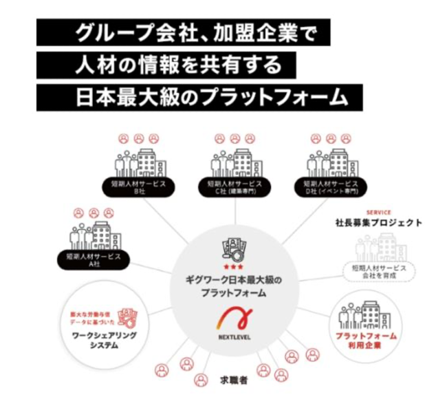 ネクストレベルを含めグループ会社、加盟企業がワーカーを集め管理しているギグワークプラットフォームです。