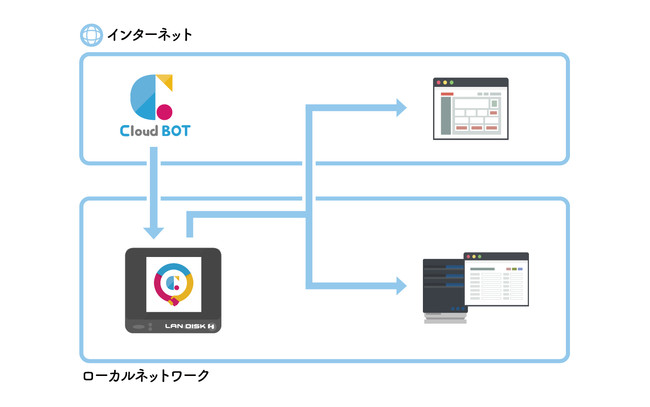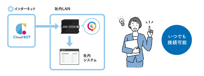 ローカルネットワーク内にCloud BOT Agentが搭載されたLAN DISK HA(*1)を設置しておくだけで、昼夜問わずロボットがローカルネットワーク内にアクセス可能となる。PCのログイン状態を保持しておく必要なども無いため、利便性が飛躍的に向上した。