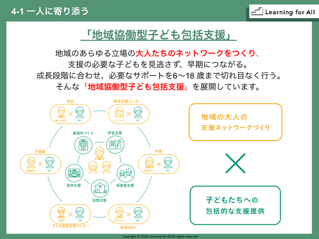 「一人に寄り添う」アプローチでは、複数の自治体において「地域協働型子ども包括支援」の実践を行っています。
