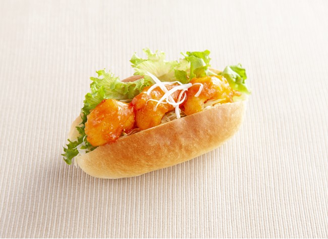 ぷりぷりの海老をたっぷりのキャベツと一緒にサンド。ふわふわコッペとエビチリの旨辛ソースがよく合います。