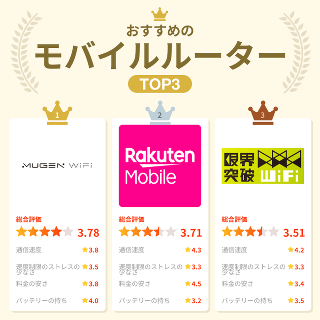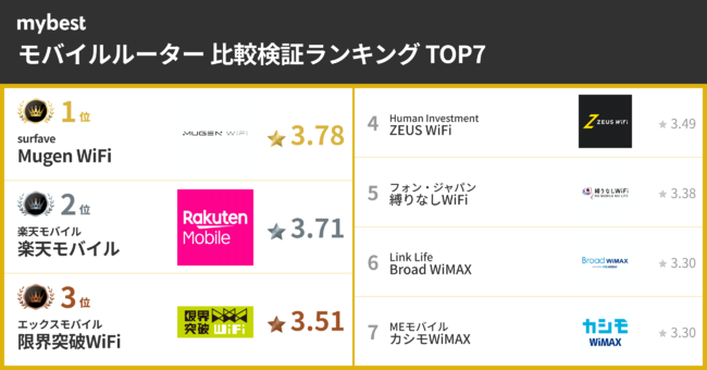 mybestが選んだベストモバイルルーターは、短期制限のない大容量の「Mugen WiFi」。実質月額料金は3,440円で100GB使えるプランのなかで最安という結果になりました。また、通信速度の検証では、都心の混雑時間帯で速度が遅くなったものの、上下ともに中央値は10Mbpsほどと安定した速度を記録しました。