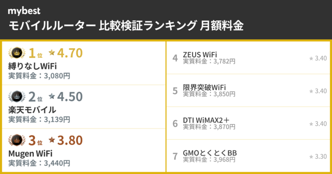 3位のMugen WiFiは、本体代金が無料で10,000円のキャッシュバックがあるため、3年間利用した際の毎月の実質料金は3,440円と相場よりも安い結果で高評価になりました。