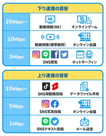 10Mbps程度あれば基本的に使えるものの、4Kの高画質での動画視聴や大容量の通信を行うオンラインゲームでは25Mbps以上の速度が必要です。