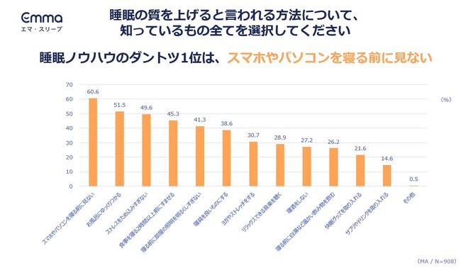 Emma Sleep Japan合同会社が実施した「睡眠の質と睡眠ノウハウに関する意識調査」にて、睡眠の質、実践中の睡眠ノウハウ、睡眠の質改善のために行ったことなどを調査いたしました。