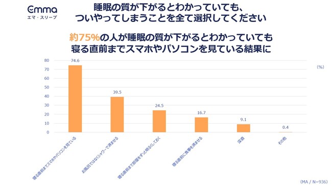 約75%の人が睡眠の質が下がるとわかっていても寝る直前までスマホやパソコンを見ている