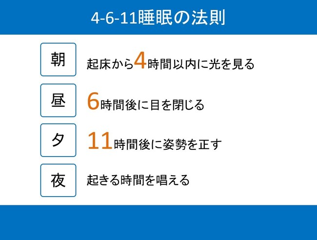 また、睡眠を司るリズムを上手に活用することで、簡単に睡眠の質を変えていくことができます。その一つに「4-6-11の睡眠の法則」(図2)があります。そのためには睡眠の3つのリズム「メラトニンリズム」「睡眠覚醒リズム」「深部体温リズム」をうまく活用することが大事です。人間は起きてから8時間後に眠くなり11時間後に元気になり、22時間後に眠くなる生き物です。朝は脳に光を届けてメラトニンを減らし、昼は計画仮眠をとり、夕方はとにかく体温を上げて、夜は暗くして過ごし、起きる時間を3回唱えることで、朝起きる準備が整っていきます。これらをすべてやる必要はありません。どれか一つが整うと、自然と他の2つも整っていくのが人間の生体リズムの仕組みです。睡眠は2週間単位で整っていくリズムがあるため、どれか一つでも2週間だけ行っていただくことで、睡眠の質が改善されていくかと思います。