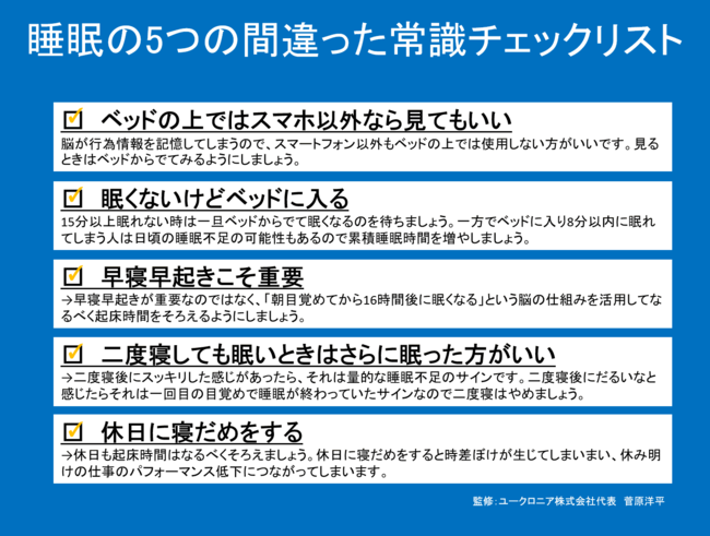 続いて、作業療法士・ユークロニア株式会社 代表取締役の菅原洋平氏をゲストにお迎えし、「忙しい人のための5分でできる快眠術」というテーマで講演いただき、その中で「睡眠の5つの間違った常識チェックリスト」をご紹介いただきました。