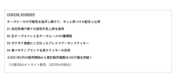 自社の放牧牛乳と平飼い卵を使い、ザクザクのプレスドアーモンドクッキーにしっとりした生チーズスフレと、極限までやわらかく仕上げた生チーズムースの2層を重ねたチーズケーキ「CHEESE WONDER」。2021年2月に誕生して約2年経つ今も、毎週金曜日と土曜日のオンラインショップ販売時には多くのお客様にアクセスしていただいています。