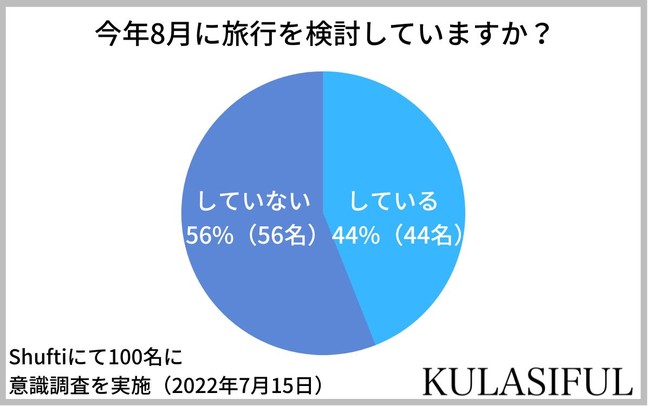 「8月に旅行を検討しているか」に対する意識調査では、「検討している」と答えた方が44%で、「検討していない」と答えた方が56%という結果になりました。