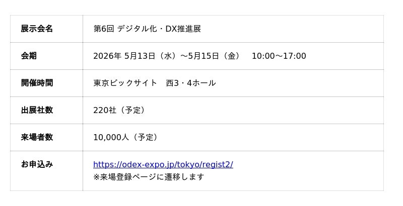 本展はデジタル化を推進したい自治体と、DXの推進により営業組織や経営基盤の強化、バックオフィスの業務効率化、働き方改革を実現したい企業に向けたBtoB展示会です。[表1: https://prtimes.jp/data/corp/151917/table/24_1_d3336402fc9c68fa9f6ab2c7a1373762.jpg?v=202604020245 ]