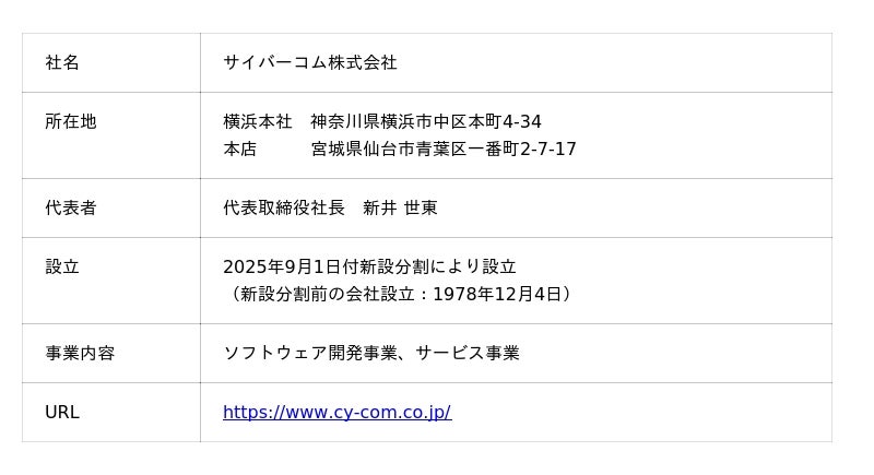 創業以来、ミッションクリティカルな通信分野での豊富なソフトウェア開発実績を活かし、AI、RPA、IoT等を活用したソフトウェア開発など、お客様の多様なニーズに応え続けております。また、クラウドサービスを活用したシステム構築、情報システムやネットワークのセキュリティを確保するSIサービスに加え、DXや業務効率化を支援するプロダクト・ソリューションを提供しており、国内7拠点(横浜、仙台、東京、新潟、名古屋、刈谷、福岡)より、お客様のビジネスの成長と変革を支援します。[表2: https://prtimes.jp/data/corp/151917/table/24_2_fc81f5e5d7fc51261c93f089893660f4.jpg?v=202604020245 ]