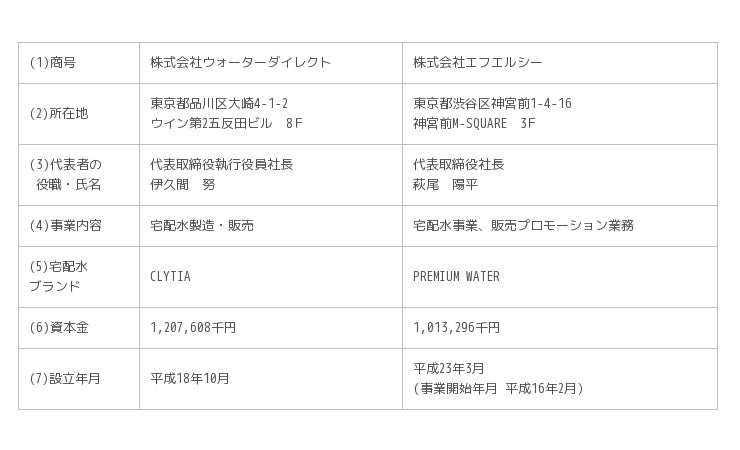 株式会社ウォーターダイレクト(本社:東京都品川区、代表取締役 執行役員社長:伊久間 努、以下「ウォーターダイレクト」といいます。)と株式会社エフエルシー(本社:東京都渋谷区、代表取締役社長:萩尾 陽平、以下「エフエルシー」といいます。)は、宅配水製造・販売事業(以下「本事業」といいます。)において、業務提携(以下、「本業務提携」といいます。)に関する基本合意書を締結いたしましたので、お知らせいたします。