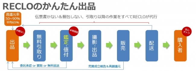 RECLOは「スマートリユース」を提唱し、簡単・安心・高還元を実現するCtoBtoCのハイブランドリユースサービスです。査定・出品から配送までの面倒な作業をワンストップで提供するとともに、正規品保証・返品保証をそなえた安心安全なプラットフォームを展開。さらに、世界約200ヶ国で在庫連携されたネットワークにより高い販売力を誇るため在庫リスクが少なく、その分出品者へ高く還元する委託販売システムを導入するなどフリマアプリや買取とは異なるサービスを展開しています。