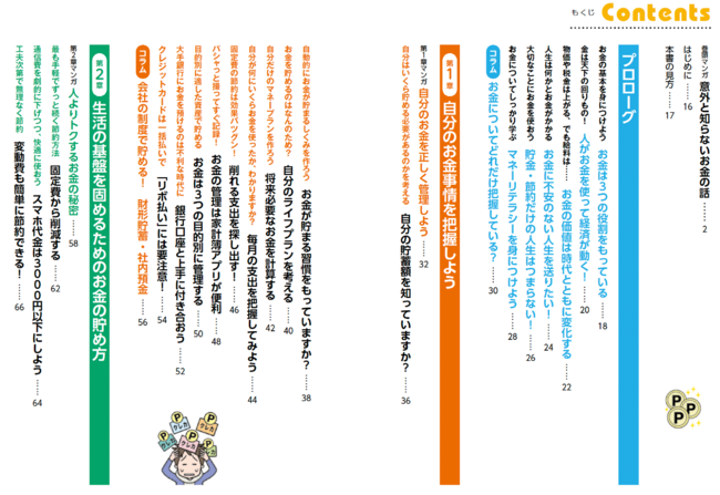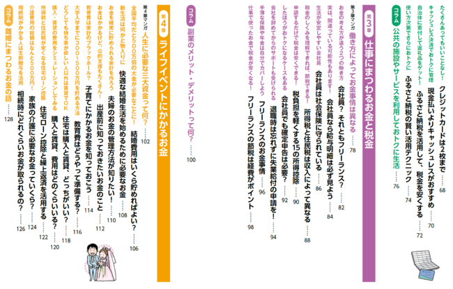 これからお金のことを学びたいという超初心者の方でも無理なく理解できるように、お金を貯めるための家計管理の基本から節税の知識、ライフイベントにかかるお金、保険の知識、資産運用の知識にいたるまで、幅広いお金の知識を豊富な図版やマンガで解説しています。