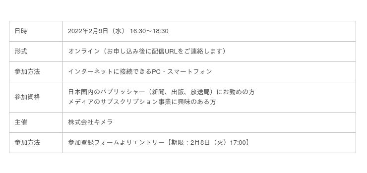 メディアのサブスクリプション管理プラットフォームを提供する株式会社キメラが主催