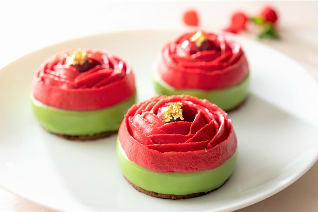 横浜市の花でもある「薔薇」をイメージした可憐なケーキ。ピスタチオのムースにフランボワーズのジュレを重ね、花びらに見立てたフランボワーズクリームを絞った目にも美しい逸品です。