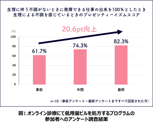 ポーラ・オルビスホールディングスでは、2021年7月より半年間、同社及び一部子会社の女性従業員の月経随伴症状改善を目的に、オンライン診療にて低用量ピルを処方するプログラムを実証導入しました。プログラム参加者へのアンケート調査※1では、生理に伴う体の不調がないときに発揮できる仕事の出来を100%としたとき、生理中に不調を感じている状況での自身の仕事のパフォーマンスを数値化してたずねる質問において、プログラム参加前は平均61.7%だった回答が、参加後は平均82.3%と20.6ポイントの向上が見られました。
