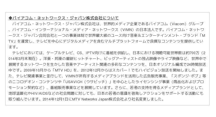 米国バイアコム・インターナショナル・メディア・ネットワークス傘下で、世界最大級のユース向け音楽&エンターテインメント・ブランド「MTV」を日本で展開するバイアコム・ネットワークス・ジャパン株式会社(東京都港区、代表取締役社長:井股進)とHJホールディングス株式会社(東京都港区、代表取締役社長:於保 浩之)は、6月1日(木)から、Huluで新チャンネル「MTV MIX」のリアルタイム配信を開始いたします。定額制動画配信サービスにおける「MTV MIX」のリアルタイム配信サービスはアジア初となります。