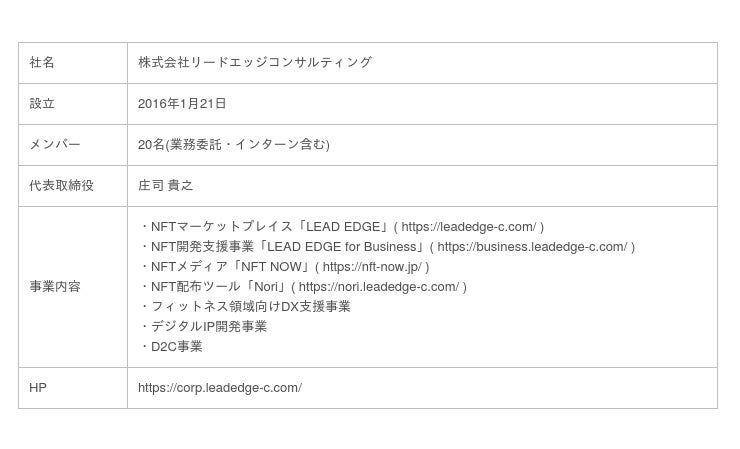 リードエッジコンサルティングは世の中の「あらゆるモノ」が保有する価値をデジタルの力を通じて世の中に届けていくことを目的として、NFT事業を中心とした複数事業を展開しております。Polygonチェーンの独自コントラクトでNFTを発行できるマーケットプレイス「LEAD EDGE」をはじめとしてNFTメディアや支援事業などを行っております。