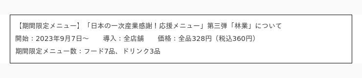 【期間限定メニュー】「日本の一次産業感謝!応援メニュー」第三弾「林業」