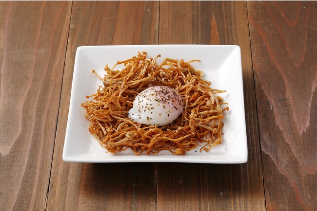 素揚げしたえのきに温泉玉子をトッピングしました。