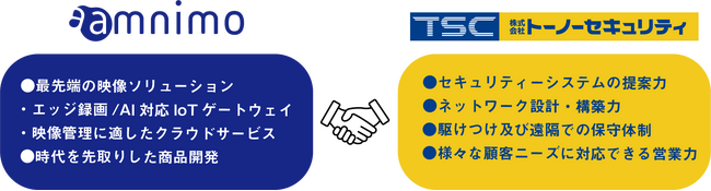 これらの需要に応えるため、アムニモとトーノーセキュリティは、アムニモが開発・提供するハードウェア、ソフトウェア・クラウド製品群と、トーノーセキュリティのセキュリティーシステムに関する提案力や導入・設置、保守・運用のノウハウを組み合わせた協業体制を強固にするべく、この度の締結に至りました。