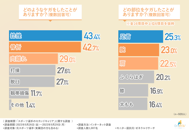 【スポーツ選手のセカンドキャリアに関する調査】9割以上が現役時代にケガを経験!足首のケガが最も多い結果に
