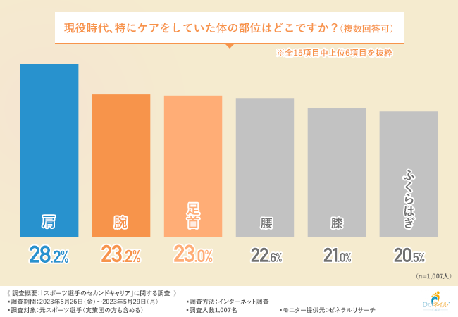 「現役時代、特にケアをしていた体の部位はどこですか?(複数回答可)」と質問したところ、『肩(28.2%)』と回答した方が最も多く、次いで『腕(23.2%)』『足首(23.0%)』と続きました。