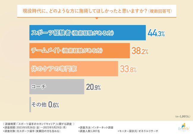 「現役時代に、どのような方に施術してほしかったと思いますか?(複数回答可)」と質問したところ、『スポーツ経験者(施術経験がある方)(44.3%)』と回答した方が最も多く、次いで『チームメイト(施術経験がある方)(38.2%)』『体のケアの専門家(33.8%)』と続きました。