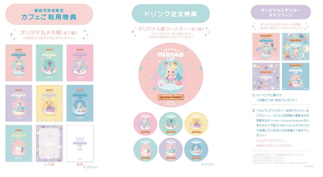 2)「シルバニアファミリー公式アカウント」をフォローし、カフェ利用時に撮影された写真をSNS(Twitter、Instagram、Facebook)のいずれかにて下記のハッシュタグをつけて投稿していただいたお客様に「オリジナルステッカー(全4種)」を1枚ランダムにプレゼント!
