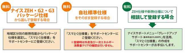 「スマとく」のご利用に当たっては、事前に断熱材及び住宅設備機器の仕様をナイスサポートシステムにご登録いただきます。具体的には、1.「ナイスZEH」「G2」「G3」の各パッケージ仕様の中から選択して登録する方法、2.自社標準仕様をそのまま登録する方法、3.ZEH仕様や断熱仕様について個別に相談して登録する方法のいずれかをお選びいただきます。あらかじめご登録をいただくことで、その後は、実物件の図面をご提供いただければ、必要に応じて、省エネ計算や各種申請代行、光熱費シミュレーションといったサポートメニューを、スピーディーにご利用いただくことができます。