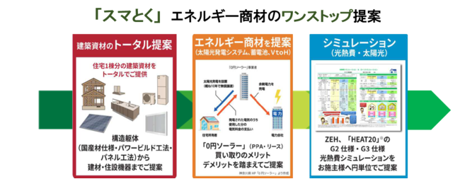 今回新たに提供を開始した「スマとく」では、ZEHの普及に向けて、エネルギー商材を含む建築資材をトータルにご提案いたします。加えて、光熱費・ローンシミュレーション、外皮や一次エネルギー消費量など省エネ計算、長期優良住宅やBELSなど各種申請代行など、ZEHに関して一気通貫でサポートいたします。