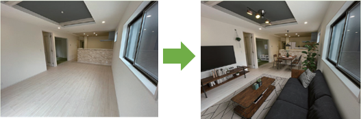 工務店様が自社の住まいづくりをより伝えやすいよう、自社の建築事例の画像に、家具や家電などをCG加工で追加し、リアリティのある空間イメージをご提供します。