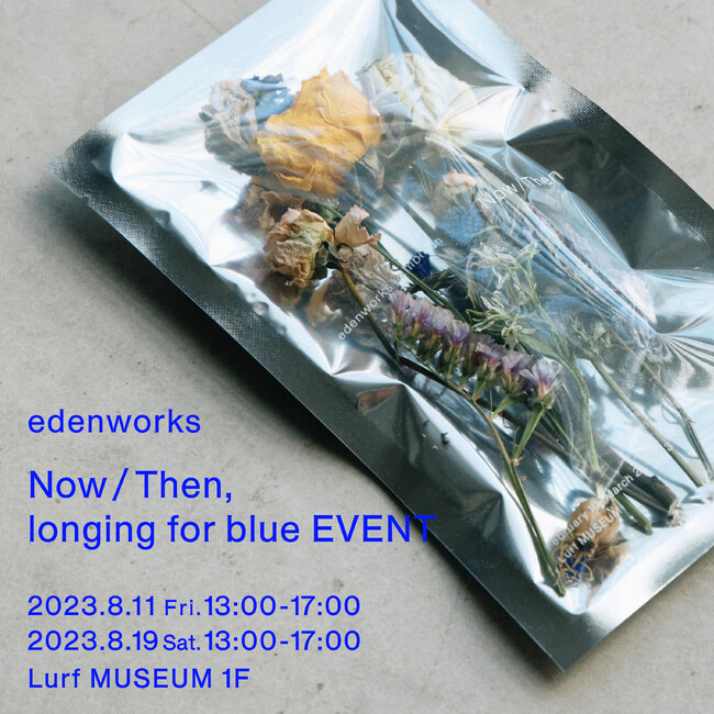 Lurf MUSEUM(ルーフミュージアム)1Fでは、edenworks(エデンワークス)を主宰するアーティスト篠崎恵美によるエキシビジョン「Now/Then, longing for blue」を開催いたします。本展は今年2月に開催した「Now/Then」にて、会期中に会場でドライフラワーになった花を解体して再構築した新しい形。続編として「Now/Then, longing for blue」を展示いたします。さらに展示に合わせて制作したグッズをLurf MUSEUMの店頭・オンラインストアにて販売。展示会期は8月9日(水)〜 8月21日(月)まで。
