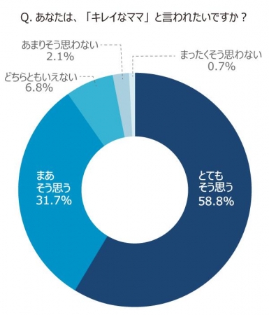 「“キレイなママ”と言われたいですか?」という質問に対し、「とてもそう思う」は58.8%、「まあそう思う」は31.7%で、あわせると実に9割以上のママが「キレイなママ」と言われたいという意識を持っています。また、「誰のために“キレイなママ”でいたいですか?」という質問では、「子供」が80.9%で圧倒的に1位。ついで、「自分自身」67.8%、「パパ」58.7%と続き、家族や自分のためという考えが多数。一方で、「パパ以外の異性」というママが10.1%いることが判明しました。