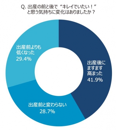 「出産の前と後で“キレイでいたい!”と思う気持ちに変化はありましたか?」という質問に対して、「ある」と答えた人は7割以上。うち、「高まった」人は41.9%、「低くなった」人は29.4%。出産という体型や意識が変わる大きなきっかけを通じて、体型や意識をキープしたい/もっと向上させたいというママと、育児に忙しくて諦めてしまうママと分かれました。