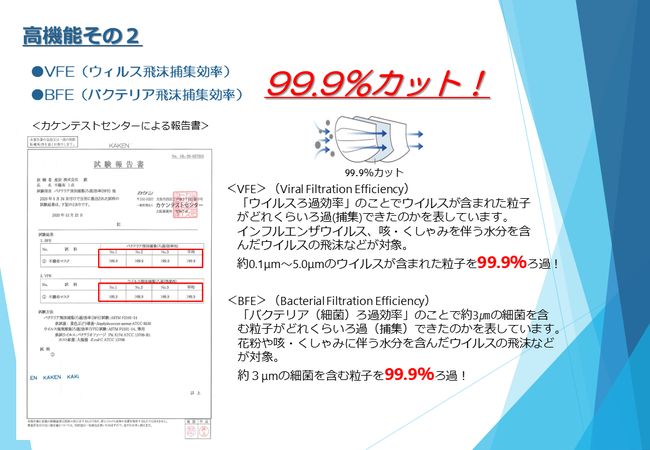 マスク内部のフィルターはウィルス飛沫や花粉などを防ぐ微粒子捕集効率(BFE,VFE,PEF) 99%以上の最高品質の素材を使用。さらに銀と亜鉛のナノイオン技術でマスクに付着したウィルス.細菌の繁殖を99%以上抗菌します。