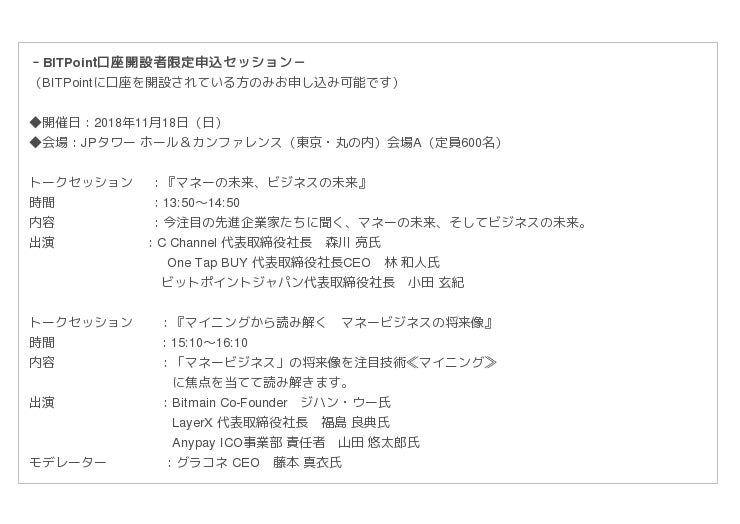 今回、BITPointは口座開設者限定の2セッションを提供します。日本で初めて講演を行う数学者で、e-cash考案者であるデヴィット・ショーム氏や、マイニング機器大手であるBitmain Co-Founderジハン・ウー氏の登壇が予定されています。さらに、アナリストによる仮想通貨の本当の可能性、セキュリティや法整備の現状、ブロックチェーン技術の最新展望、そして最先端の企業家たちを招いた「マネーの進化とビジネスの進化」など、多くの有用なセッションが執り行われます。
