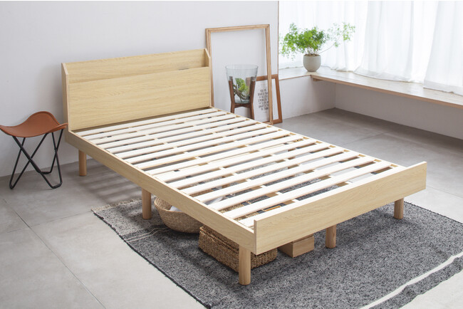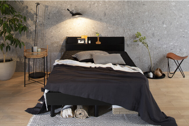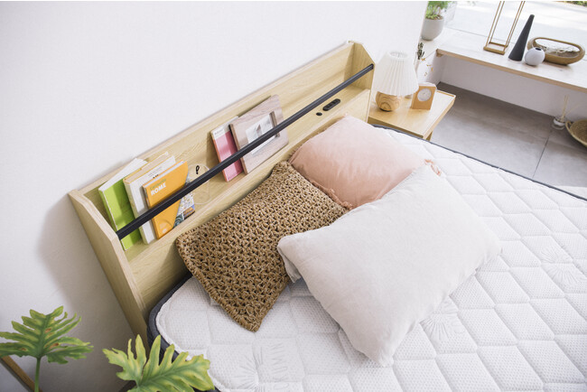3.スマホの充電にも便利なコンセント2口(計1500W)が付いた奥行き8.4cmの宮棚には、前板が付いているので小物が落ちにくく、雑誌や本も立てかけて置けます。コンセントはスライド式でホコリが入りにくい工夫も。宮棚の背面上部にはLEDの間接照明を配置。やわらかく温かな灯りが、安らぎ空間を演出します。フレーム表面には見た目も美しい木目調デザインのメラミン化粧板を採用、傷付きにくく耐久性に優れています。カラーはナチュラル・ブラウン・ブラックの3カラーをご用意しました。※木目の見え方は商品により違う場合がございます