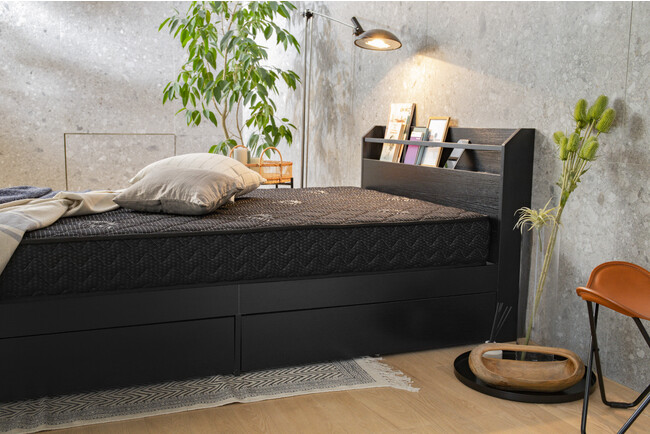 2. ベッド下には2つに分かれた引き出し収納付き。2杯合わせて89Lの大容量収納が可能で、シーズンオフのものから普段使用するものまで大量に収納できるので、お部屋がスッキリ片付きます。また引き出しのない側にもベッド下収納が可能で、カゴや収納ボックスを置くことも。引き出しはお部屋のレイアウトに合わせて左右どちら側でも設置可能、キャスター付きで開閉はスムーズ、引き出しが奥に入り込まないようにストッパーを付ける工夫も施しています。