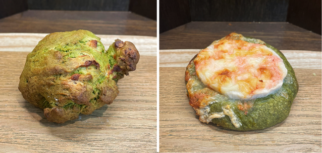 抹茶を練り込んだフォカッチャ生地にレンコンと明太子フィリング、シュレッドチーズを乗せ焼き上げました。