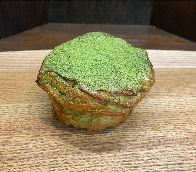 抹茶のデニッシュ生地にカレーフィリングを乗せ焼き上げ、マスカルポーネチーズ、抹茶をトッピングしました。