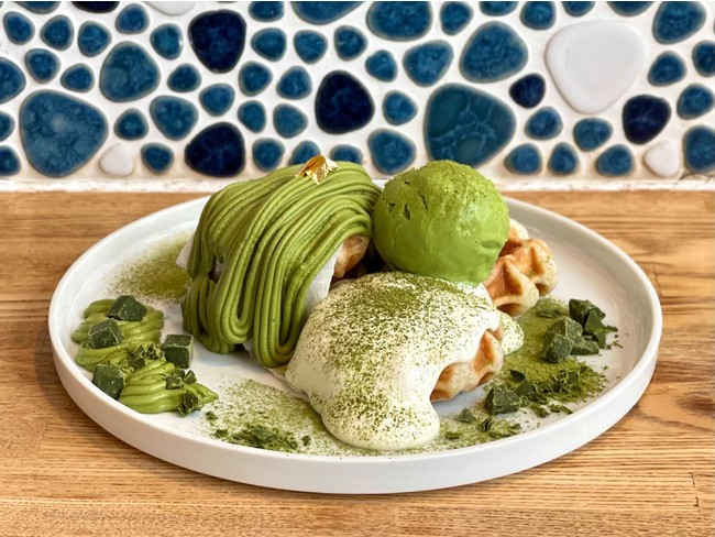 当店大人気のオリジナル食パン「ムー」をワッフル型で焼いたムッフル。ほんのり甘い濃厚抹茶モンブラン、抹茶アイス、とろーりクリーム、求肥、本格抹茶チョコレート、抹茶ソースと合わせた贅沢抹茶づくしのワンプレート。別添えの抹茶ソースをかけながら味の変化をお楽しみください。