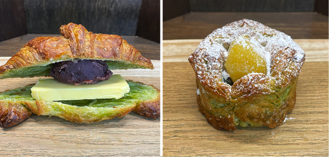 抹茶のクロワッサンにあんこと有塩バターを挟みました。
