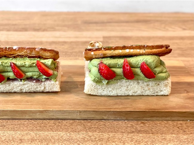 高級抹茶を使用したクリームとあんこと苺をサクサクのパイと大人気メープルマスカルポーネパンではさみました。
