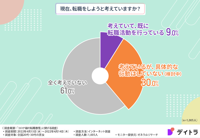 「現在、転職をしようと考えていますか?」と質問したところ、『考えていて、既に転職活動を行っている(9.0%)』『考えているが、具体的な行動はしていない(検討中)30.0%』『全く考えていない(61.0%)』と続きました。