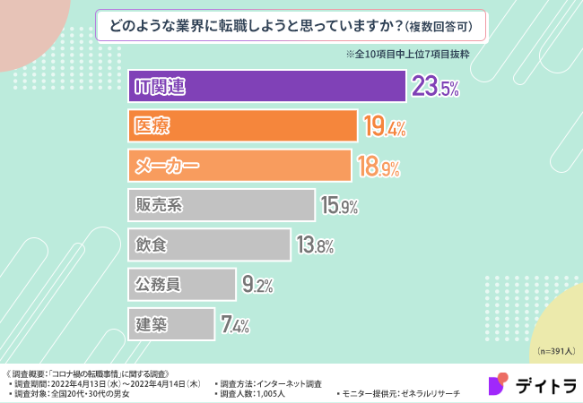 今回の調査で、コロナ禍以降、実際に転職した方は2割にとどまりましたが、転職を検討している方は4割と比較的多く、主にIT関連への転職を考えているようです。