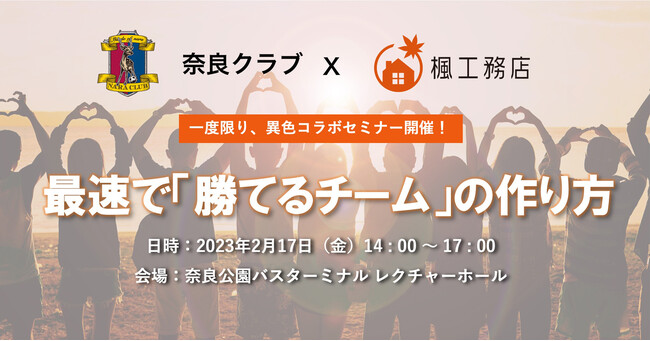 奈良・京都南部を中心に注文住宅やリフォーム、不動産などを手掛ける株式会社楓工務店(代表 田尻 忠義 以下、当社)は、2023年2月17日(金)奈良公園バスターミナル レクチャーホールにて、当社がゴールドパートナーを務めているサッカークラブ、奈良クラブとの異色コラボセミナー、最速で「勝てるチーム」の作り方を開催します。