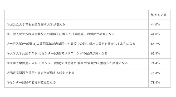 「センター試験の名称が変更になること」や「記述式問題が増える想定であること」は80%近い保護者が「知っている」と回答したのに対して、「4.国公立大学でも面接を課す大学が増える」「6.一般入試でも課外活動などの実績を記載した「調査書」の提出が必要になる」などを知っていたのは半数以下という結果に。