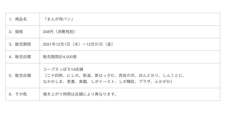 この度、この表紙を飾った「まんが肉パン」をコープさっぽろ14店舗にて期間数量限定販売をいたします。